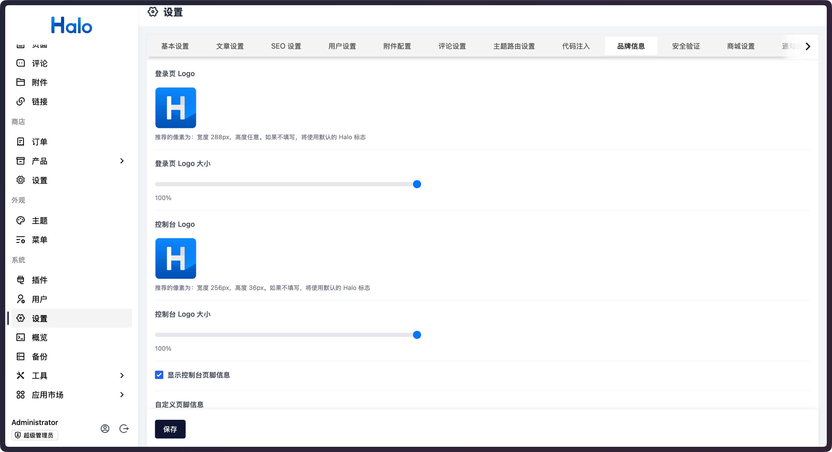 • 登录页 Logo:登录、注册等页面的 Logo 设置,如果不填写将默认使用 Halo 的标志。
