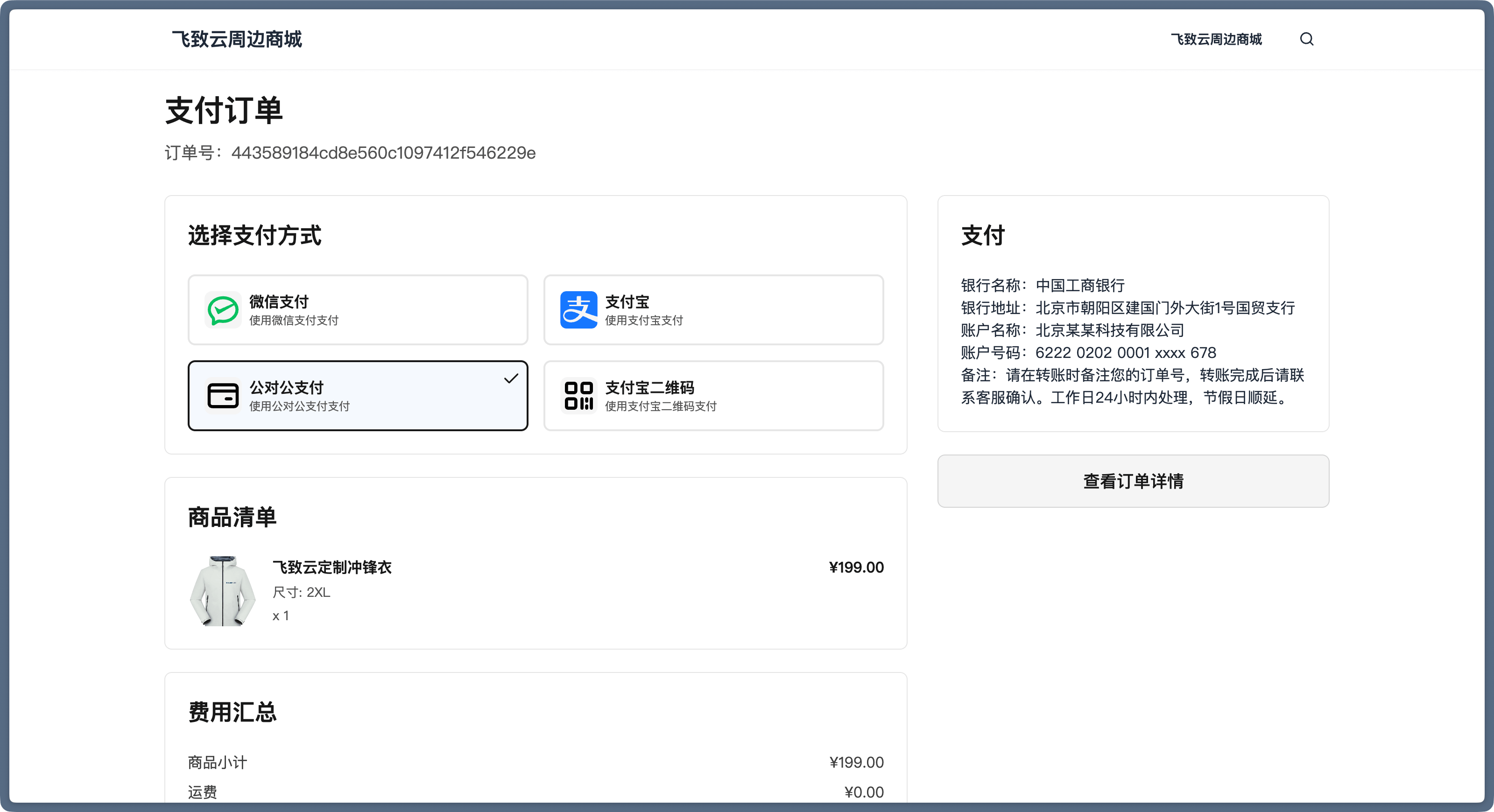 银行转账支付方式不经过 Halo 的支付系统,仅仅是在支付的时候显示商家的银行收款信息,让买家转账到商家的银行账户,后续再通过人工审核的方式确认订单。