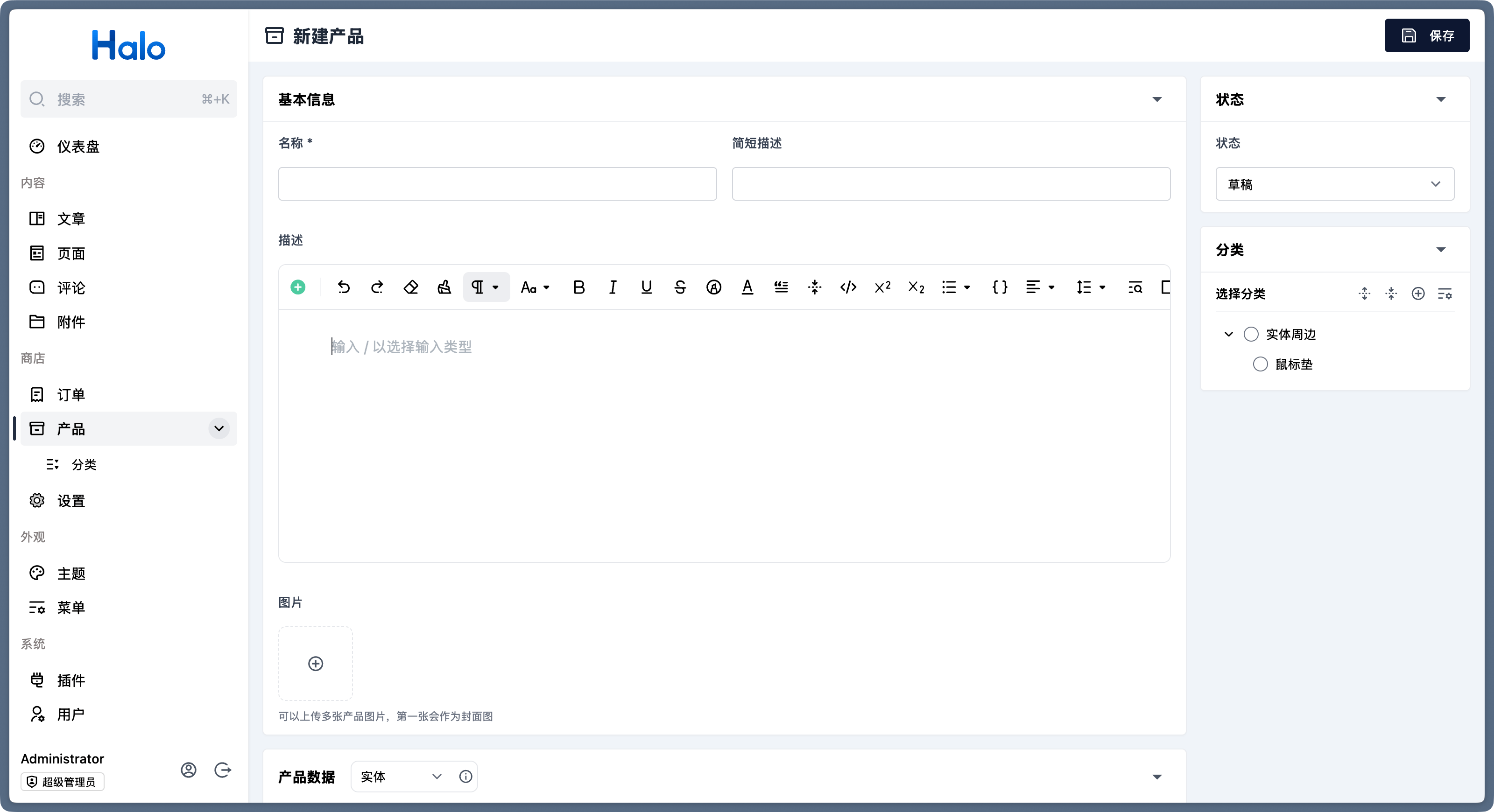 首先登录到 Halo 控制台,进入 商店 -> 产品 页面,点击右上角的新建按钮。