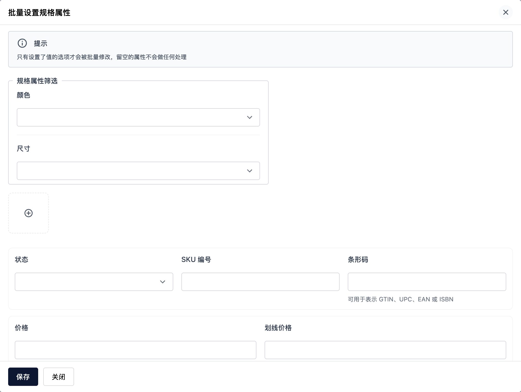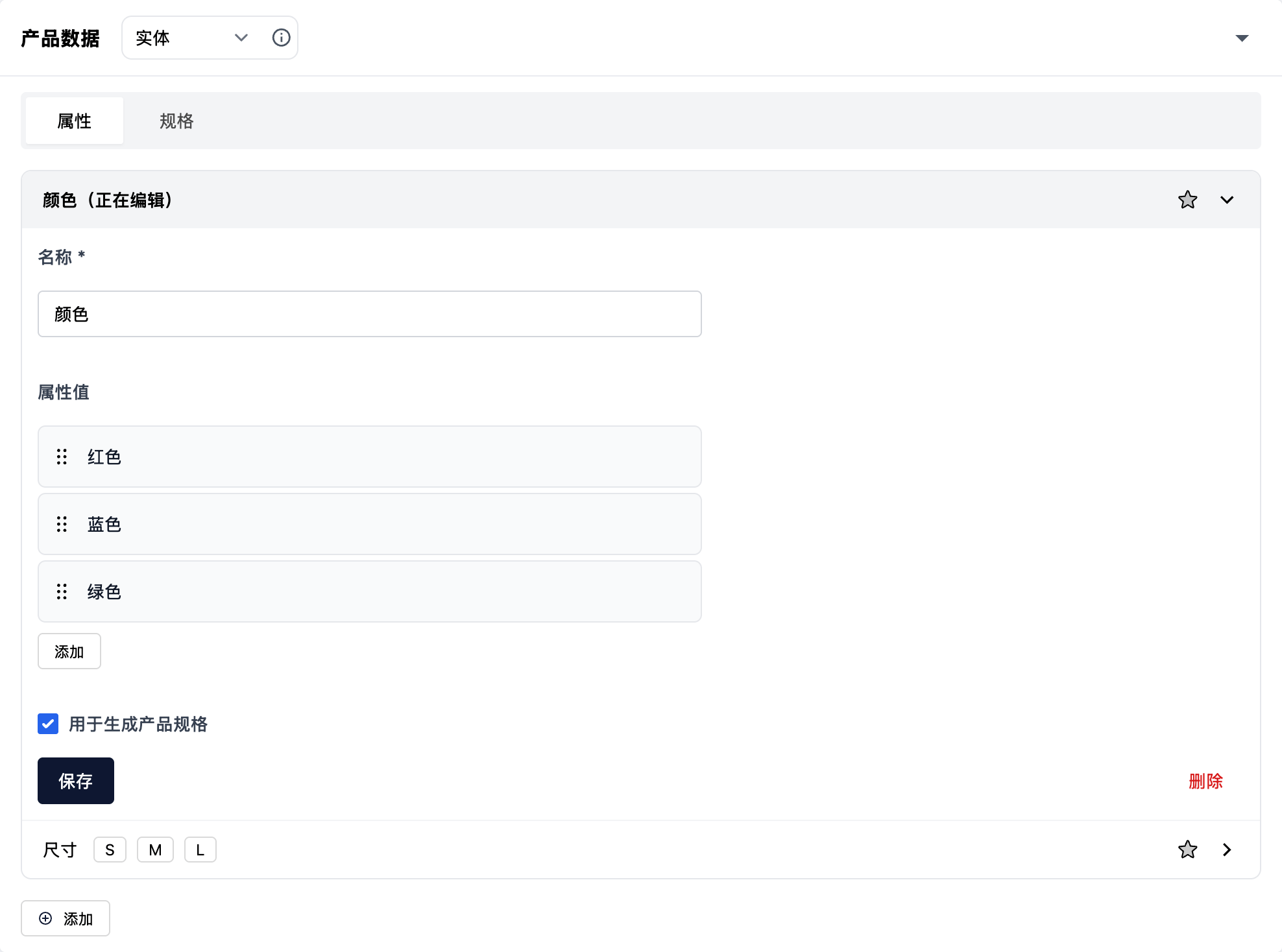 - 用于生成产品规格:勾选后,支持在配置产品规格时根据多个属性生成不同的产品规格