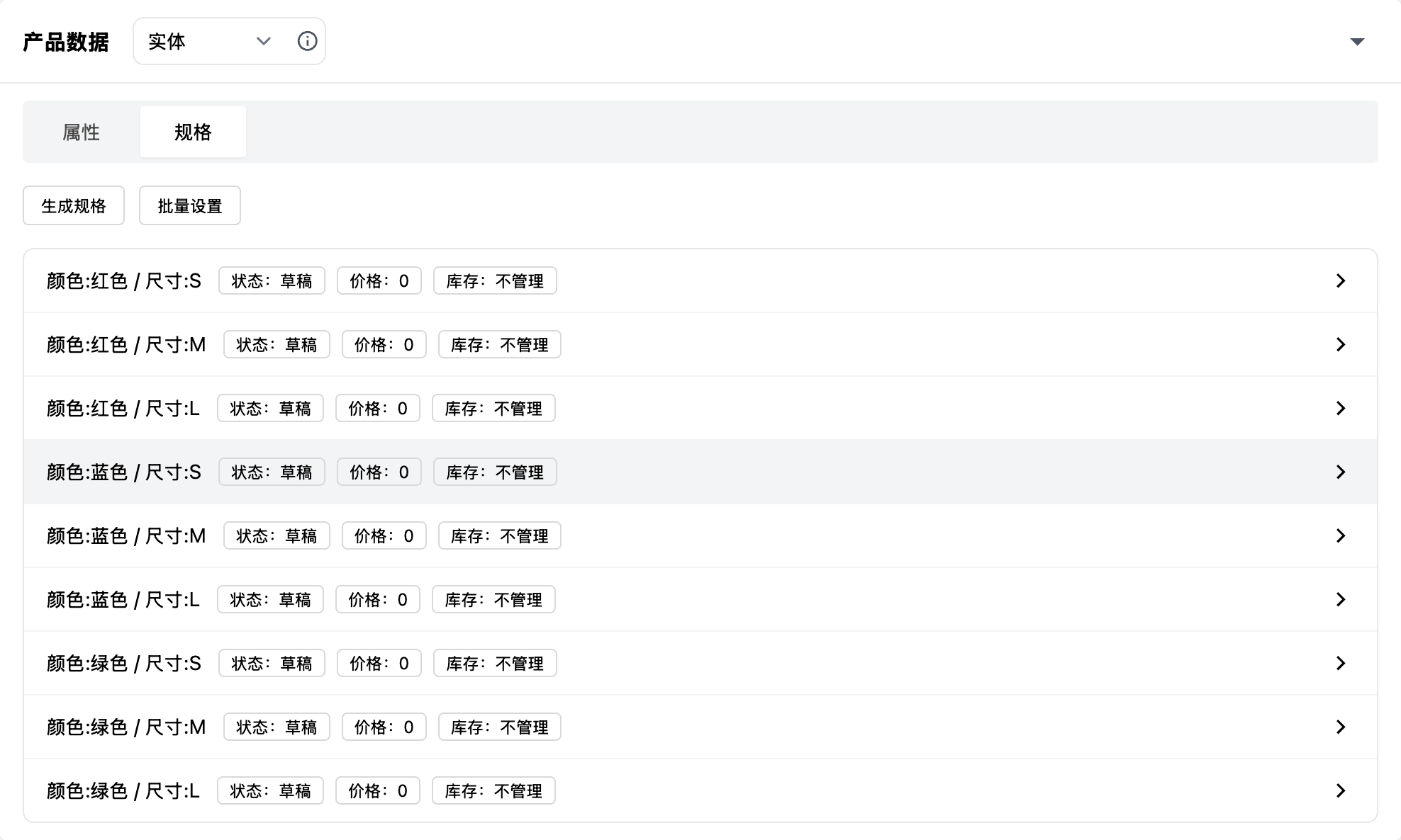 当我们设置好 属性 之后,可以点击 生成规格 按钮来批量生成所有可能产生的规格。