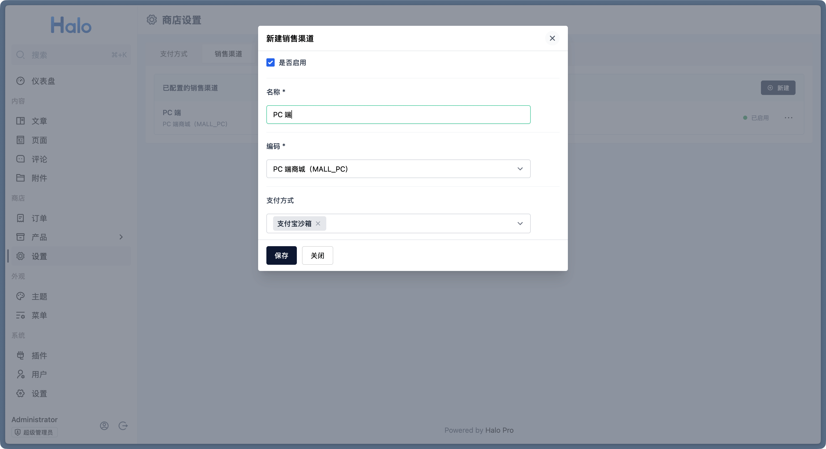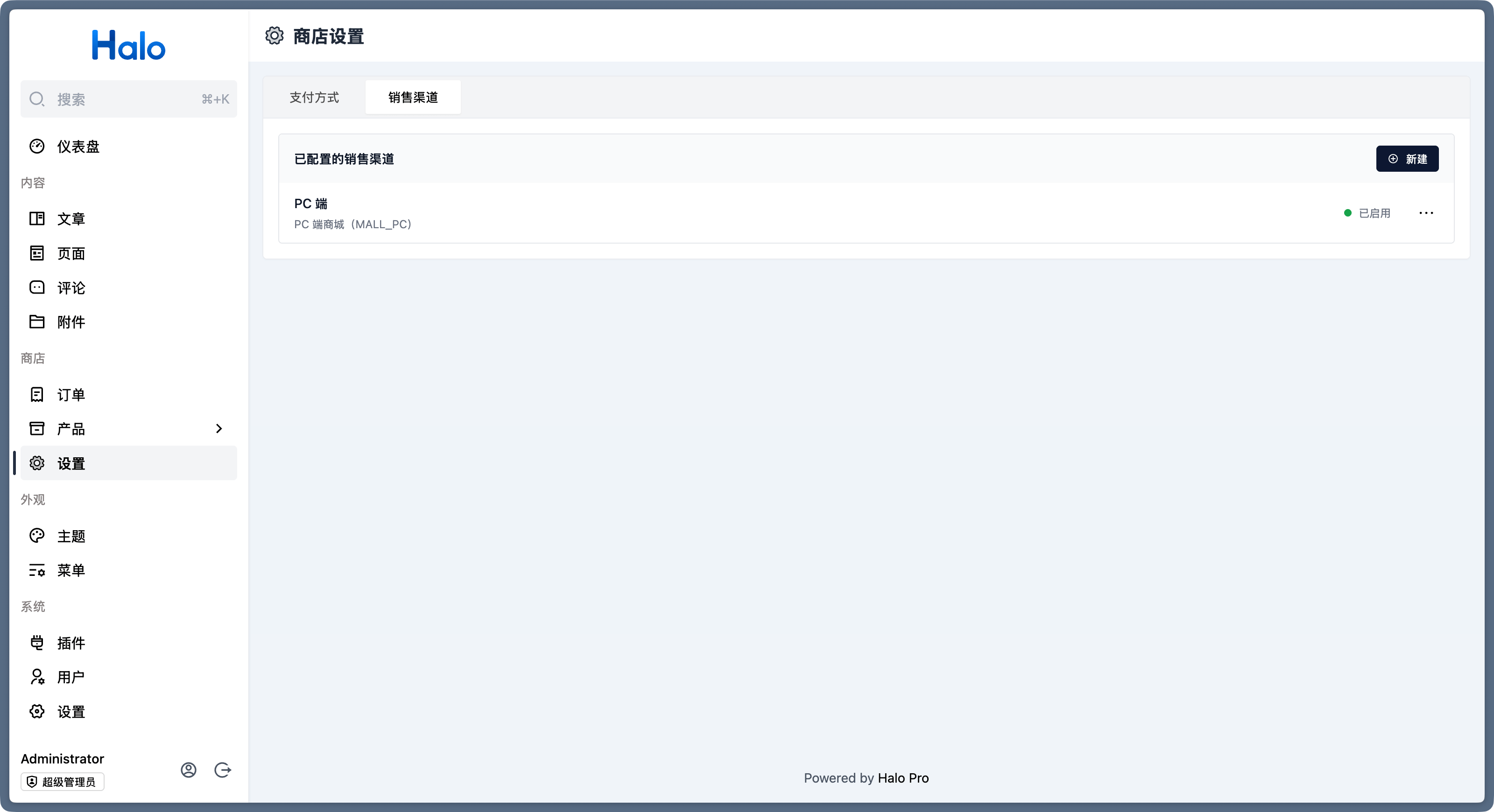 首先登录到 Halo 控制台,进入 商店 -> 设置 -> 销售渠道 页面,点击右上角的新建按钮。